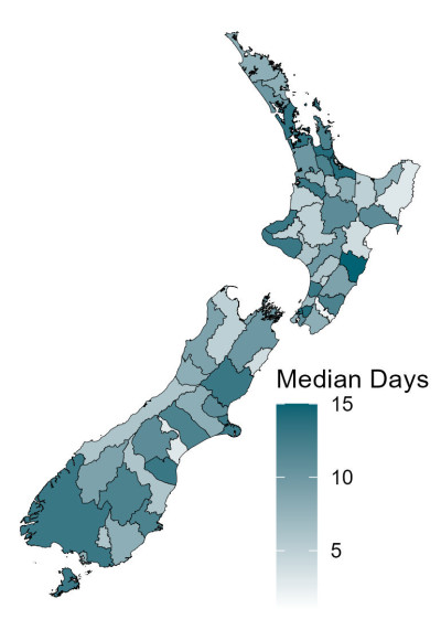 A bar chart showing the median number of days for the processing of all applications for North and South Island cities.